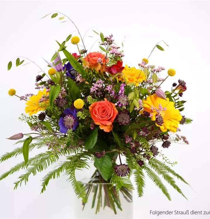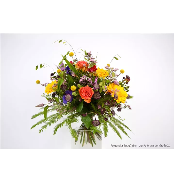 Blumen sind Naturprodukte, daher können Farbe, Form und Beschaffenheit vom hier abgebildeten Strauß abweichen. Bei nicht verfügbaren Blumen ersetzen wir diese durch gleichwertige Alternativen. Gerne können Sie uns vorab kontaktieren, falls Sie spezielle Wünsche haben.