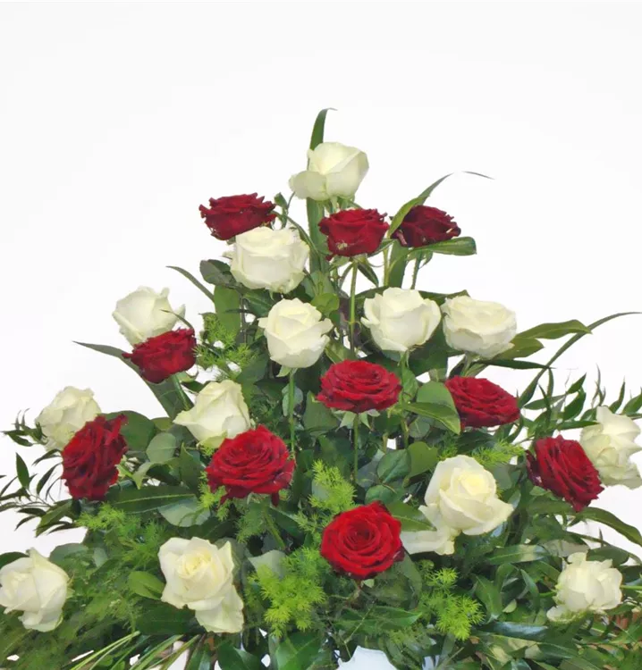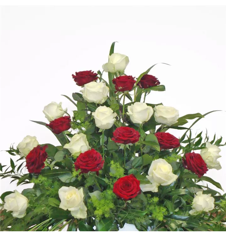 Trauergesteck mit roten und weißen Rosen