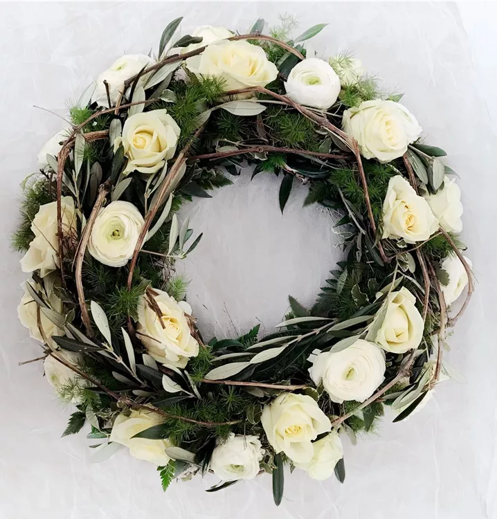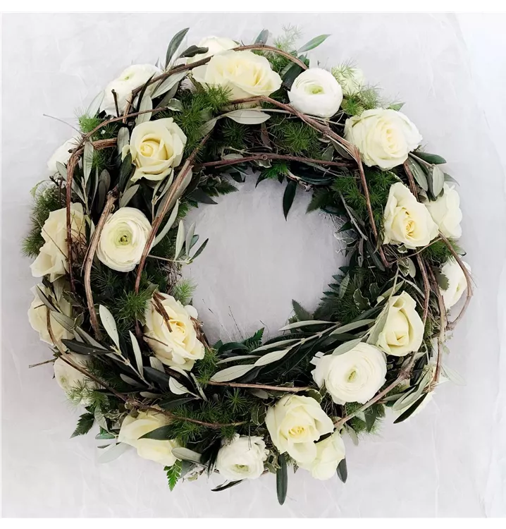 Ein liebevoll schmal rundgesteckter Trauerkranz, erhältlich in fünf Größen: