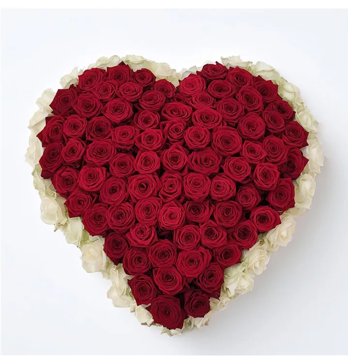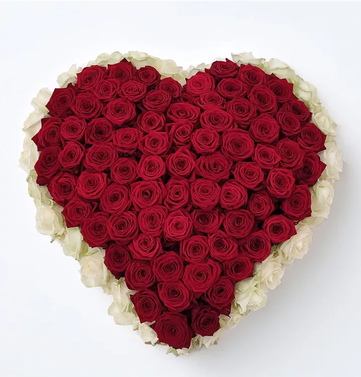 Ein liebevoll gestaltetes Herz mit intensiven roten Rosen, umrandet von weißen Rosen, erhältlich in fünf Größen.
