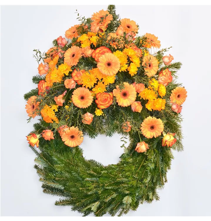 Tannenkranz mit strahlendem Blumenbouquet in Orangetönen