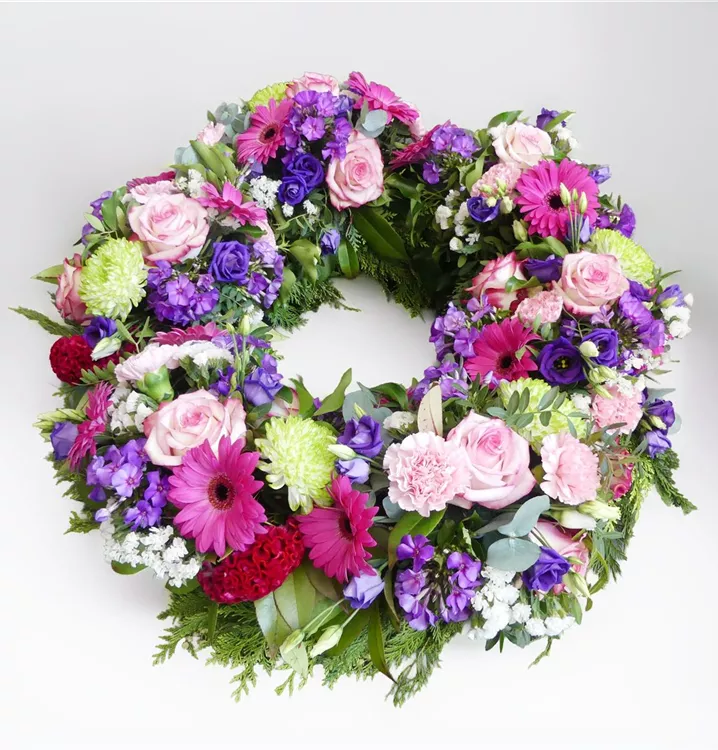 Würdevoller Trauerkranz in sanften bis intensiven Rosa- und Violettnuancen