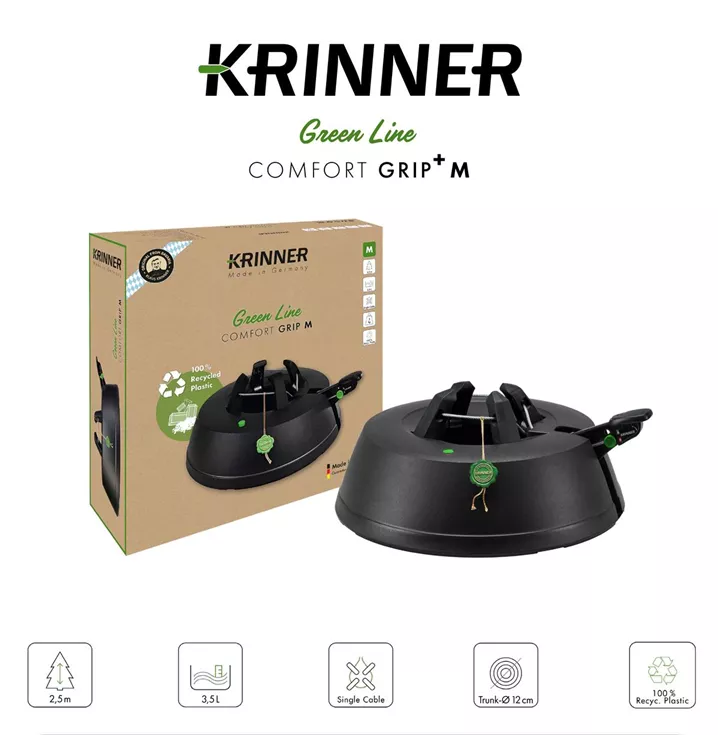 Stabiler und sicherer Christbaumständer aus 100 % recyceltem Kunststoff.