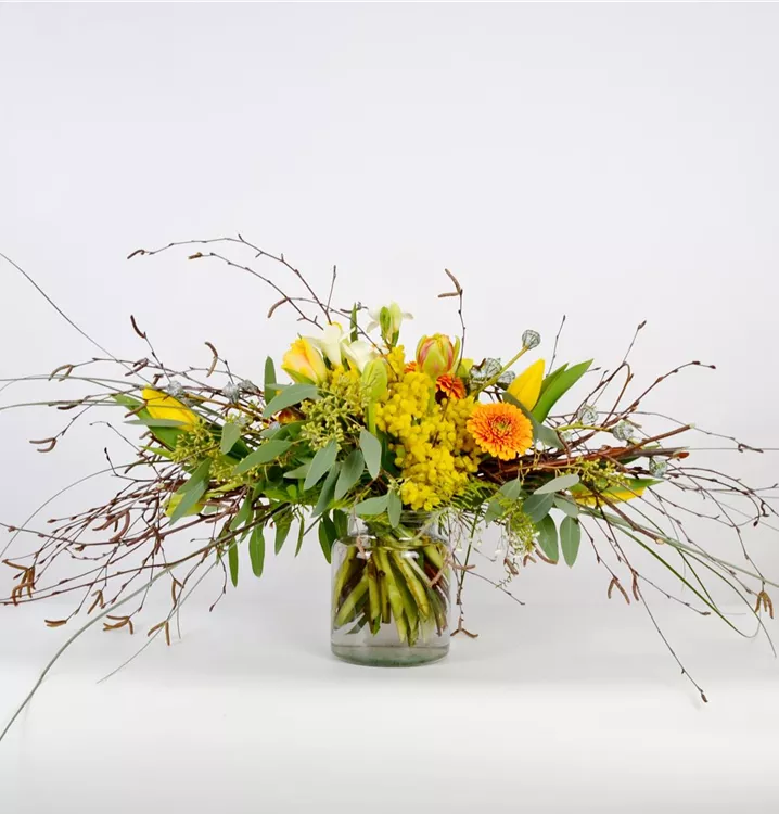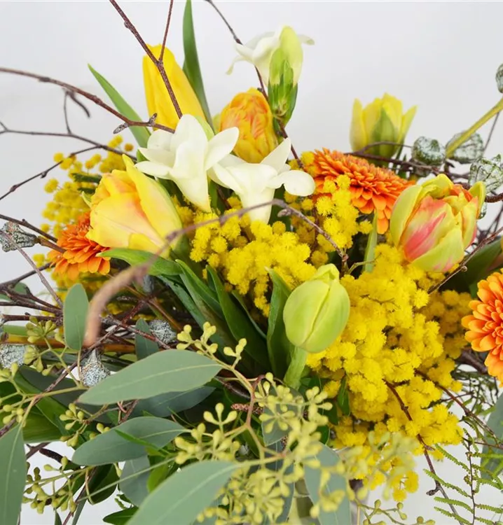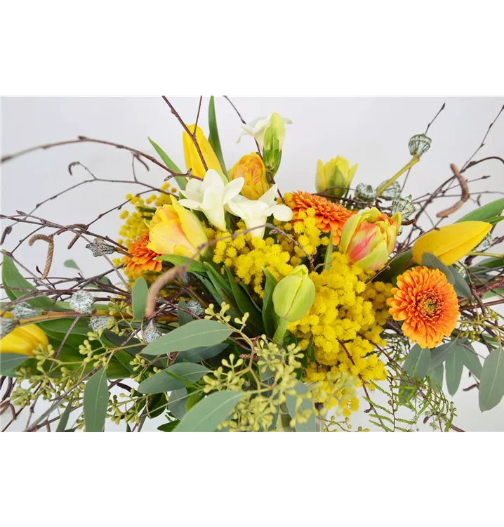 Frühlingsstrauß in Gelb- und Orangetönen, breit gebunden