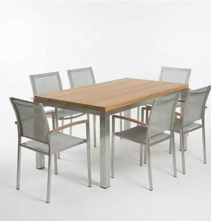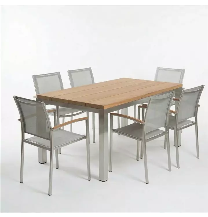 Der Tisch Como kombiniert gebürstetes Metall mit massiven Teakholz-Latten, ein Materialmix, der auf der Terrasse genauso gut aussieht wie er hält. Die sechs Monterrey-Sessel sitzen ohne Kompromisse: atmungsaktives Outdoor-Gewebe in Silber-Grau, Armlehnen mit Holzauflage, die das Teak-Design aufgreifen. Rostfreier Edelstahl, wetterfestes Gewebe, echtes Teak. Gebaut für viele Sommer.