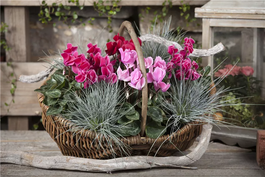 Korb mit Cyclamen Wenn es um beliebte Zimmerpflanze geht, dann sind Alpenveilchen immer ganz vorne mit dabei. Das ist auch nicht weiter verwunderlich. Sie sind robust, pflegeleicht und bedanken sich für die wenige Aufmerksamkeit, die sie fordern, mit hübschen Blüten und einer langen Blütezeit. Zimmer-Alpenveilchen bevorzugen im Haus einen eher kühlen und hellen Standort. Die optimale Raumtemperatur liegt zwischen 12 und 15 Grad und der Standort sollte keine direkte Sonneneinstrahlung bekommen. Eine Fensterbank im Schlafzimmer, eine helle Ecke im Hausflur oder auch ein Platz in der Küche sind bestes geeignet. Ein warmes Wohnzimmer sorgt allerdings eher für Unwohlsein bei der Pflanze. Außerdem sollte man als stolzer Pflanzenbesitzer Temperaturschwankungen vermeiden. Wenn es im Sommer zu heiß wird, muss das Alpenveilchen kühler gestellt werden. Gießen sollt an gerade während der Blütezeit ausgiebig. Da die Pflanzen aber empfindlich auf Staunässe reagieren, ist ein Tauchbad die optimale Variante, um sie mit ausreichend Wasser zu versorgen. Auf Wassermangel regiert die Zimmerpflanze mit hängenden Blättern, da diese nur durch Wasserdruck aufrecht erhalten werden.