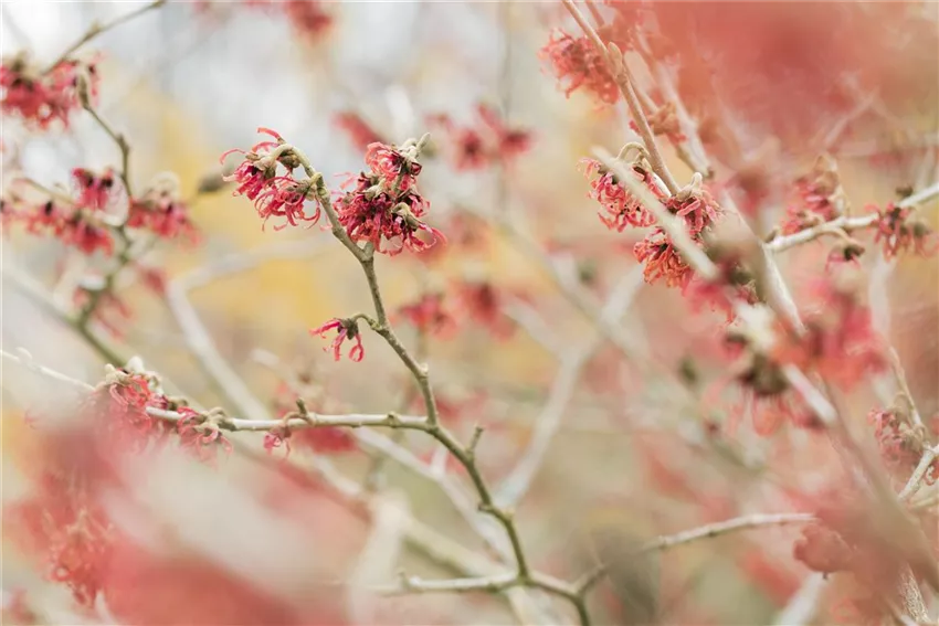Hamamelis mollis Kommen wir von weißem zu farbigem Flor. Da fällt sofort die Zaubernuss (Hamamelis) ins Auge. Kein Wintertag ist mehr öde und trist, wenn diese bizarre Schönheit blüht. Dieser prachtvolle Anblick war wohl die Ursache dafür, dass die Wünschelrutengänger sich ihre Zweige von dieser Pflanze schnitten, der sich geheimnisvolle Kräfte zusprachen. Lassen Sie eine gelb und eine rot blühende Pflanze ineinander wachsen! Ein weiterer gelber Winterblüher stellt sich mit dem Winterjasmin (Jasminum nudiflorum) vor. Bis in den Herbst hinein glänzt er mit seinem vornehmen Blattwerk, von dem er sich aber zum Winter verabschiedet. Stattdessen bietet er jetzt seine frostharten Blüten an. Auch ein Baum hat sich den frühen Winter für seine Blütezeit ausgesucht. Die Alstonia präsentiert sich am besten in größeren Gärten und Parkanlagen, denn sie wächst recht schnell und wird auch hoch. Er prangt das Jahr über mit seinem imposanten Blattwerk und ziert sich im November mit zarten grün-weißen Blüten.
