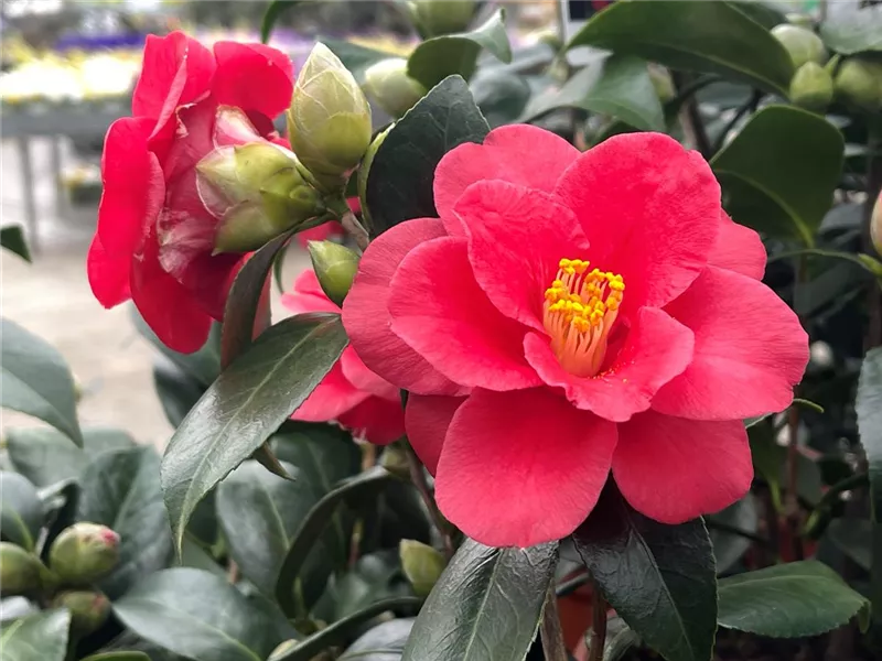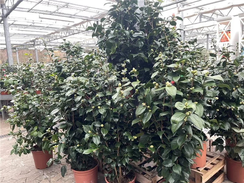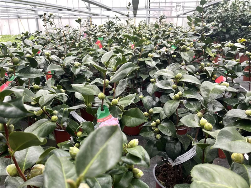 In unseren Gewächshäusern erwartet Sie gerade ein besonderer Anblick: Kamelien stehen dicht an dicht auf unseren Pflanztischen. Ein Meer aus sattem Grün, durchsetzt mit prallen Knospen, die nur darauf warten, sich zu öffnen. Die ersten mutigen Blüten haben sich bereits entfaltet und geben einen Vorgeschmack auf das, was in den kommenden Tagen und Wochen folgt.